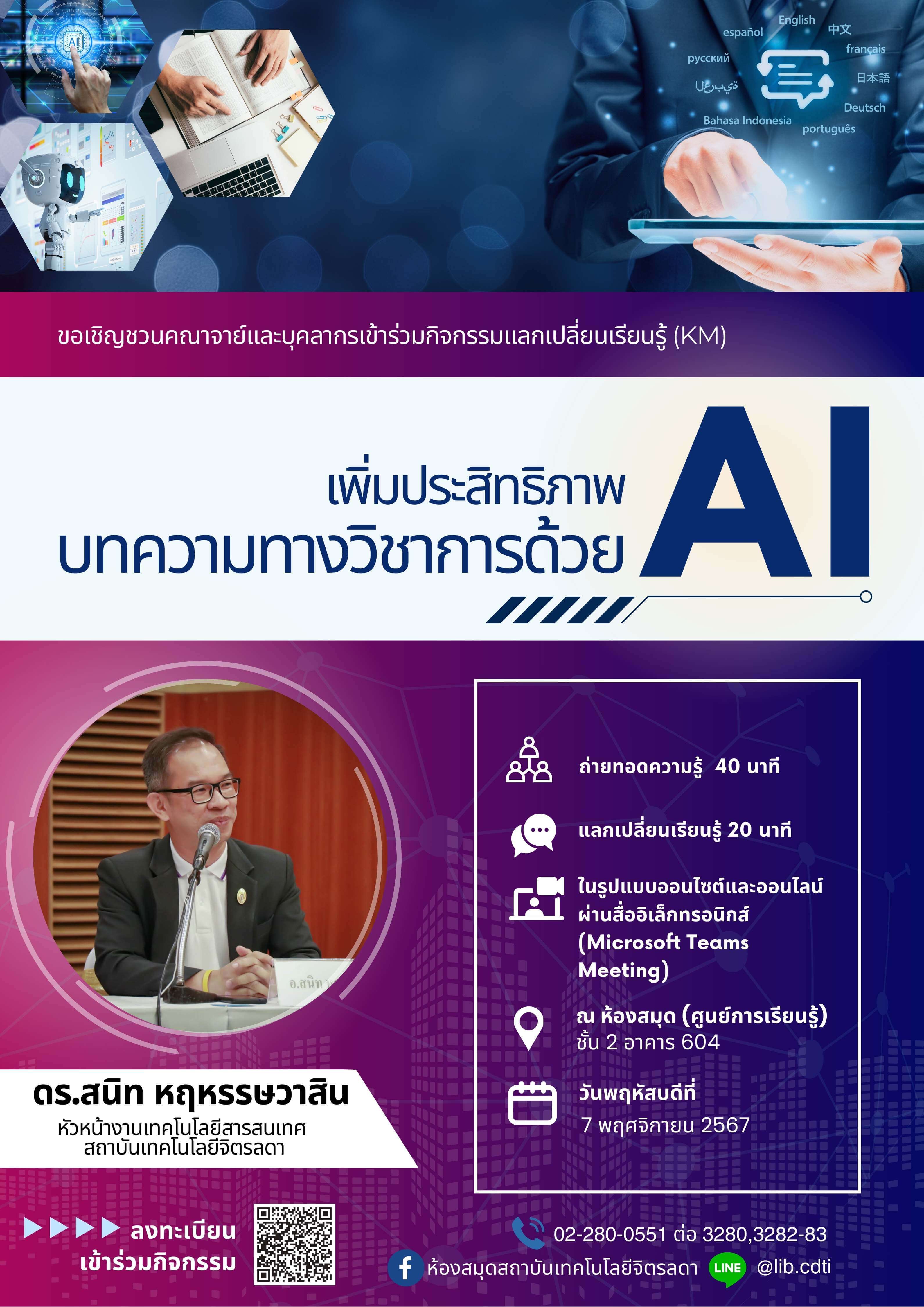กิจกรรมแลกเปลี่ยนเรียนรู้ (KM) ในหัวข้อ เพิ่มประสิทธิภาพบทความทางวิชาการด้วย AI โดย ดร.สนิทหฤหรรษวาสิน งานเทคโนโลยีสารสนเทศ จัดกิจกรรมในรูปแบบ On-site และ Online ผ่านสื่ออิเล็กทรอนิกส์ Microsoft Teams Meeting ถ่ายทอดความรู้ 45 นาที และแลกเปลี่ยนเรียนรู้ 15 นาที ในวันพฤหัสบดีที่ 7 พฤศจิกายน 2567 เวลา 13.30 – 14.30 น. ณ ห้องศูนย์การเรียนรู้ ชั้น 2 อาคาร 604