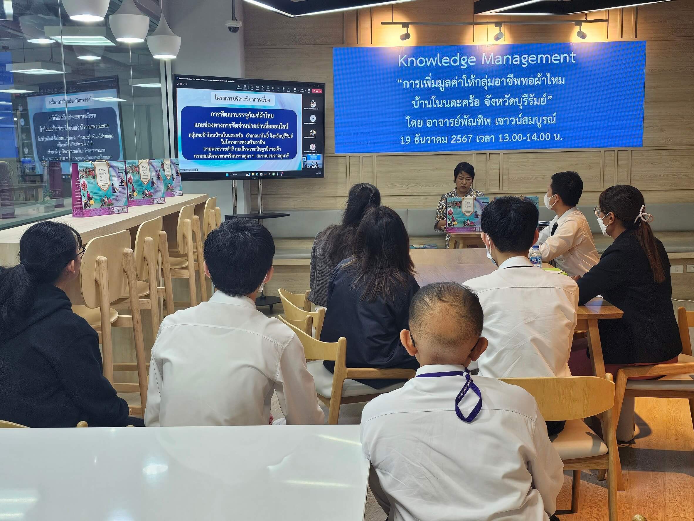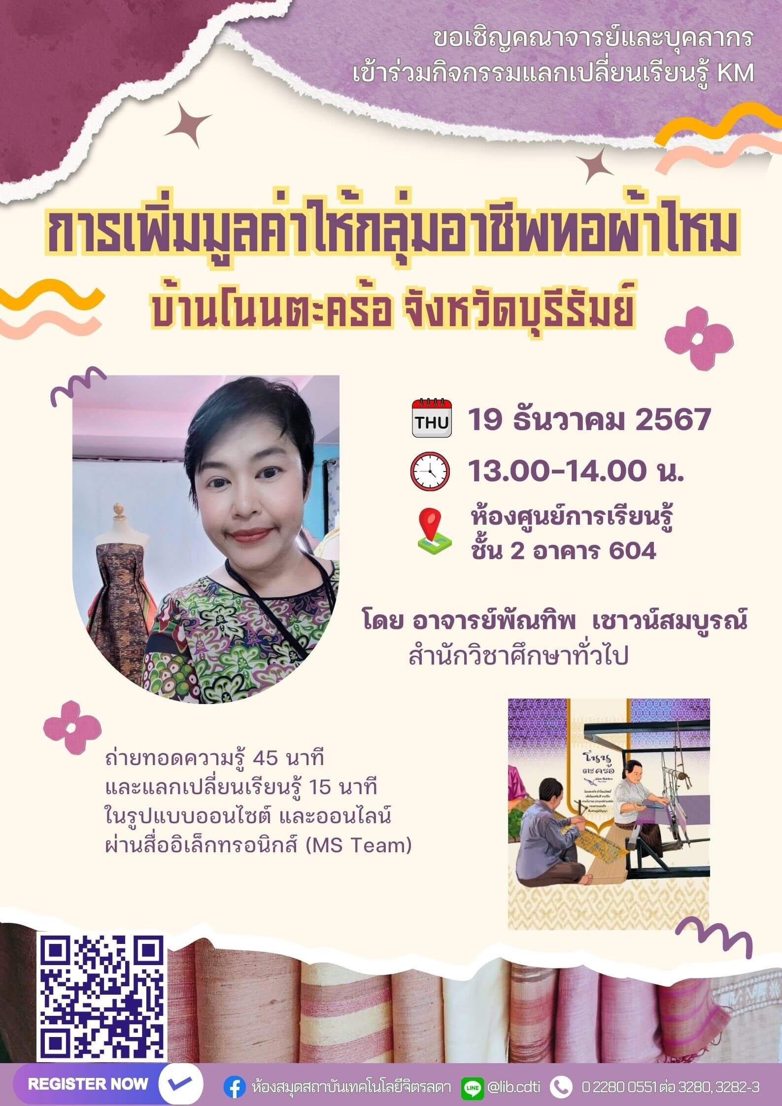 กิจกรรมแลกเปลี่ยนเรียนรู้ (KM) ในหัวข้อ การเพิ่มมูลค่าให้กลุ่มอาชีพทอผ้าไหมบ้านโนนตะคร้อจังหวัดบุรีรัมย์ โดย อาจารย์พัณทิพ เชาวน์สมบูรณ์ สำนักวิชาศึกษาทั่วไป การจัดกิจกรรมในรูปแบบ On-site และ Online ผ่านสื่ออิเล็กทรอนิกส์ Microsoft Teams Meeting ถ่ายทอดความรู้ 45 นาที และแลกเปลี่ยนเรียนรู้ 15 นาที ในวันพฤหัสบดีที่ 19 ธันวาคม 2567 เวลา 13.30 – 14.30 น. ณ ห้องศูนย์การเรียนรู้ ชั้น 2 อาคาร 604