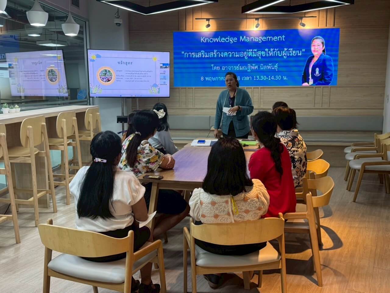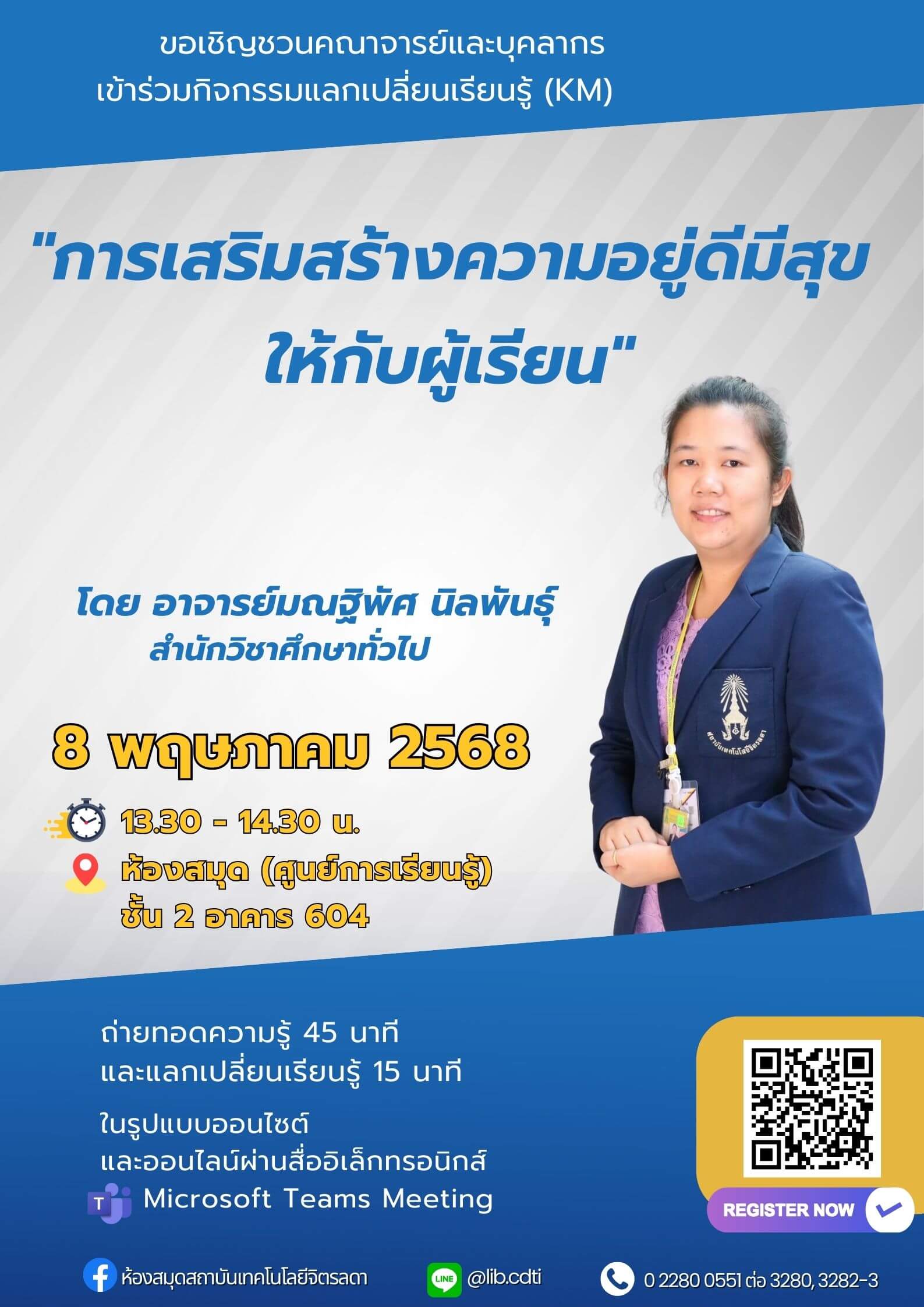 กิจกรรมแลกเปลี่ยนเรียนรู้ (KM) ในหัวข้อ “การเสริมสร้างความอยู่ดีมีสุขให้กับผู้เรียน” โดย อาจารย์มณฐิพัศ นิลพันธุ์ สำนักวิชาศึกษาทั่วไป การจัดกิจกรรมในรูปแบบ On-site และ Online ผ่านสื่ออิเล็กทรอนิกส์ Microsoft Teams Meeting ถ่ายทอดความรู้ 45 นาที และแลกเปลี่ยนเรียนรู้ 15 นาที ในวันพฤหัสบดีที่ 8 พฤษภาคม 2568 เวลา 13.30 – 14.30 น. ณ ห้องศูนย์การเรียนรู้ ชั้น 2 อาคาร 604