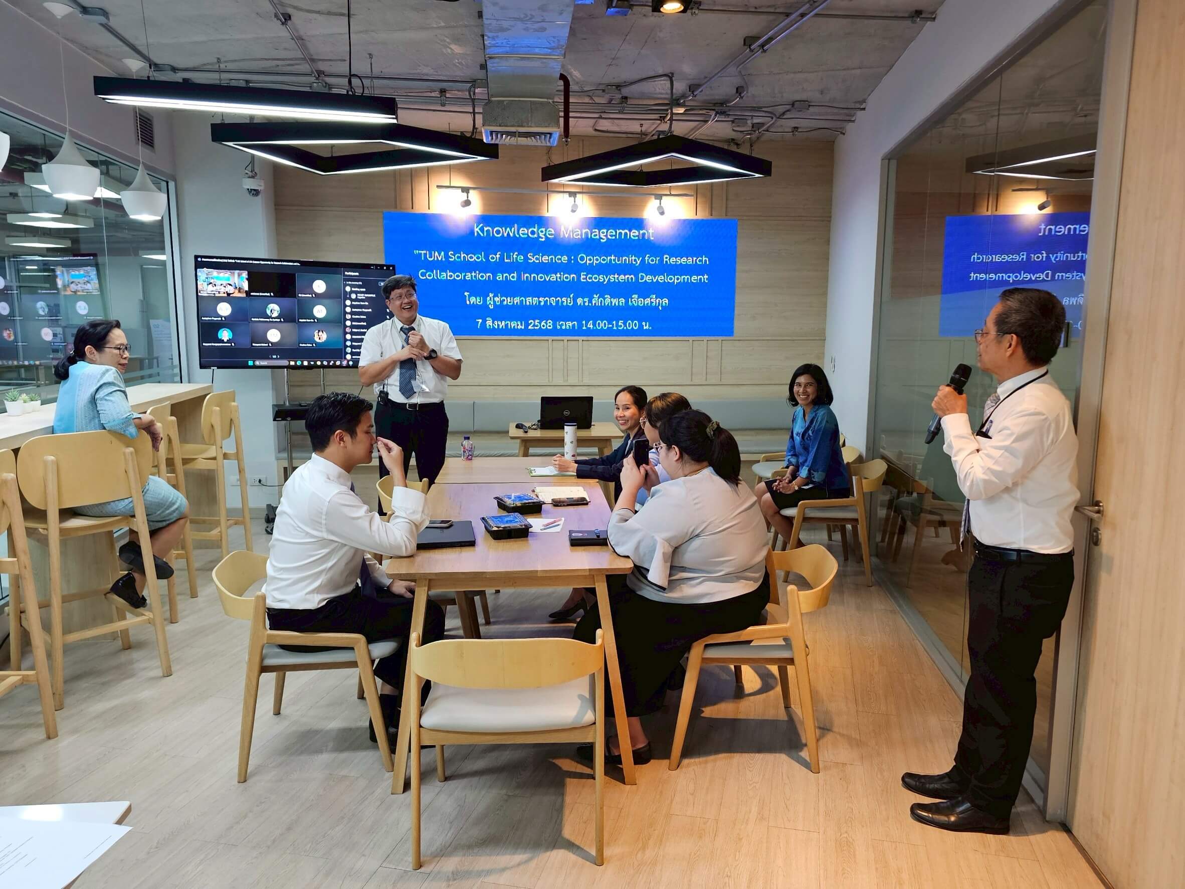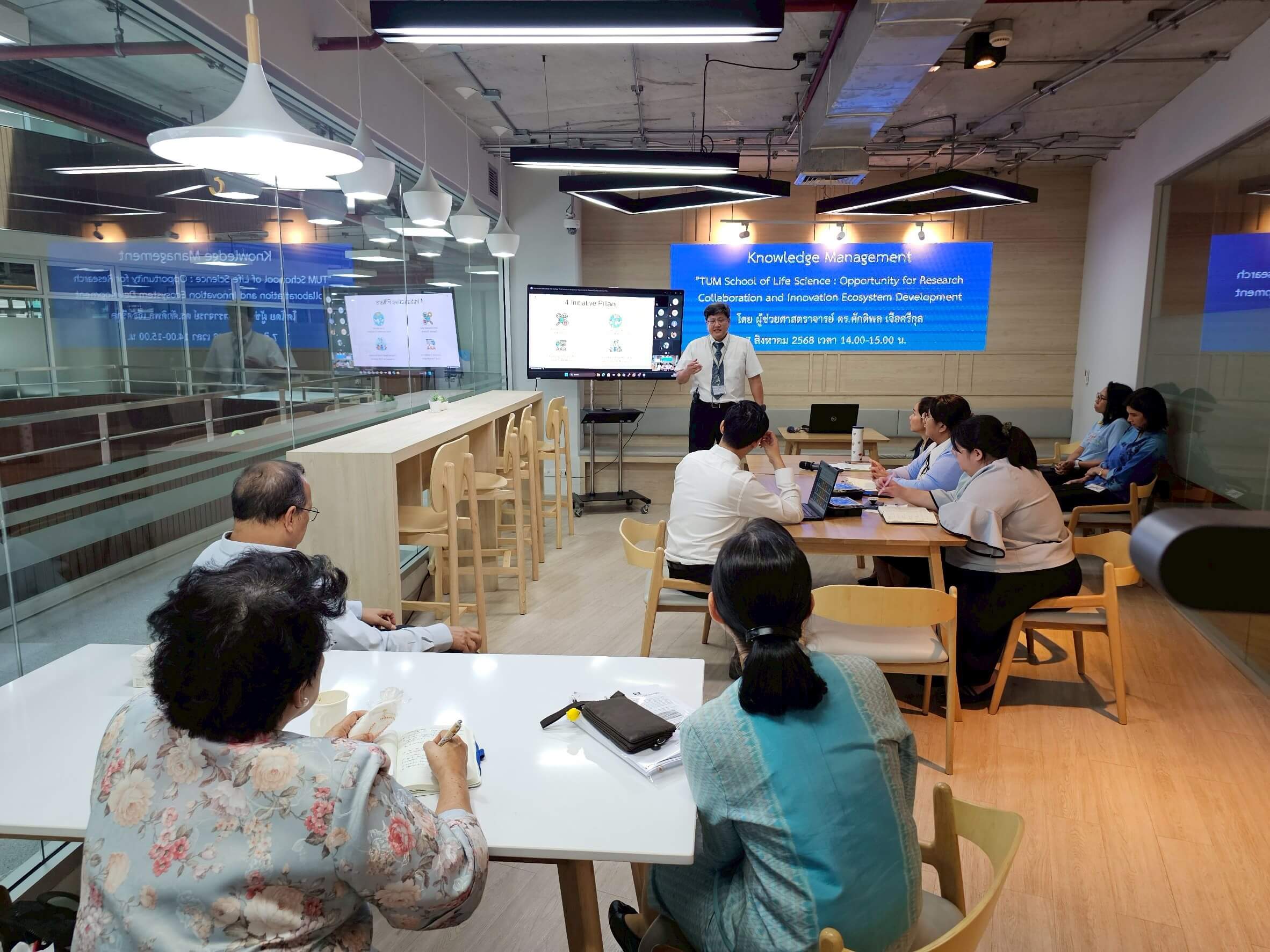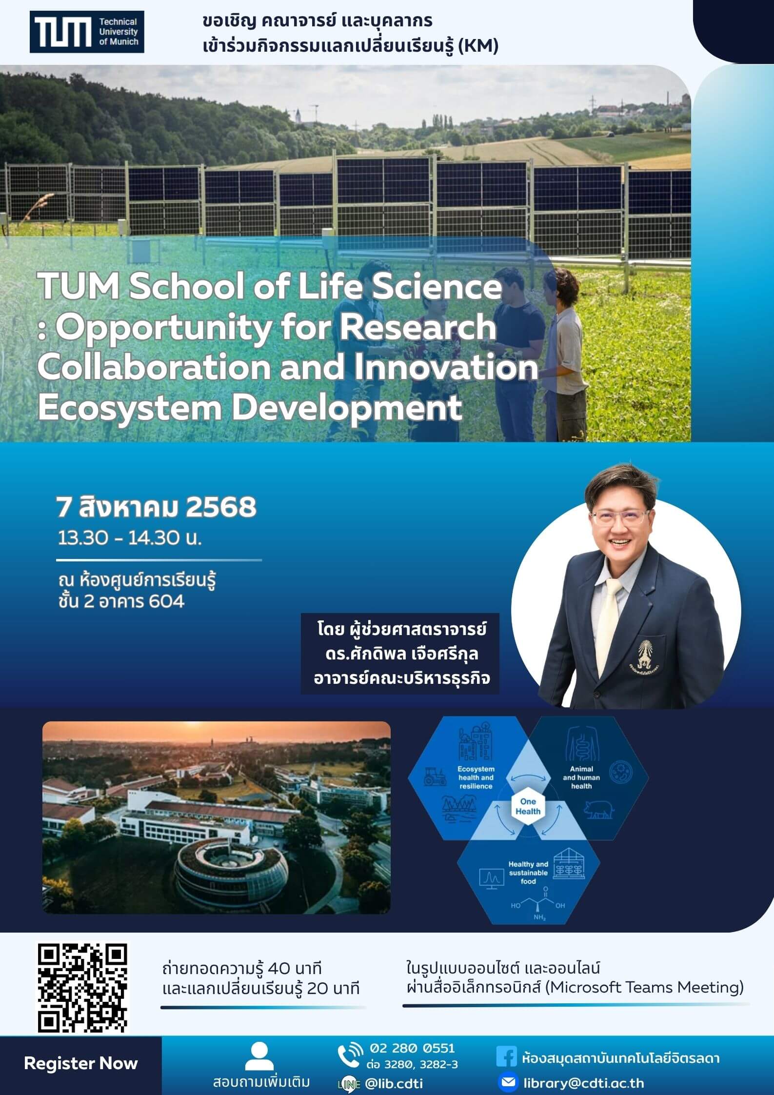 กิจกรรมแลกเปลี่ยนเรียนรู้ (KM) ในหัวข้อ TUM School of Life Science: Opportunity for Research Collaboration and Innovation Ecosystem Development โดย ผศ.ดร.ศักดิพลเจือศรีกุล คณะบริหารธุรกิจ การจัดกิจกรรมในรูปแบบ On-site และ Online ผ่านสื่ออิเล็กทรอนิกส์ Microsoft Teams Meeting ถ่ายทอดความรู้ 45 นาที และแลกเปลี่ยนเรียนรู้ 15 นาที ในวันพฤหัสบดีที่ 7 สิงหาคม 2568 เวลา 13.30 – 14.30 น. ณ ห้องศูนย์การเรียนรู้ ชั้น 2 อาคาร 604