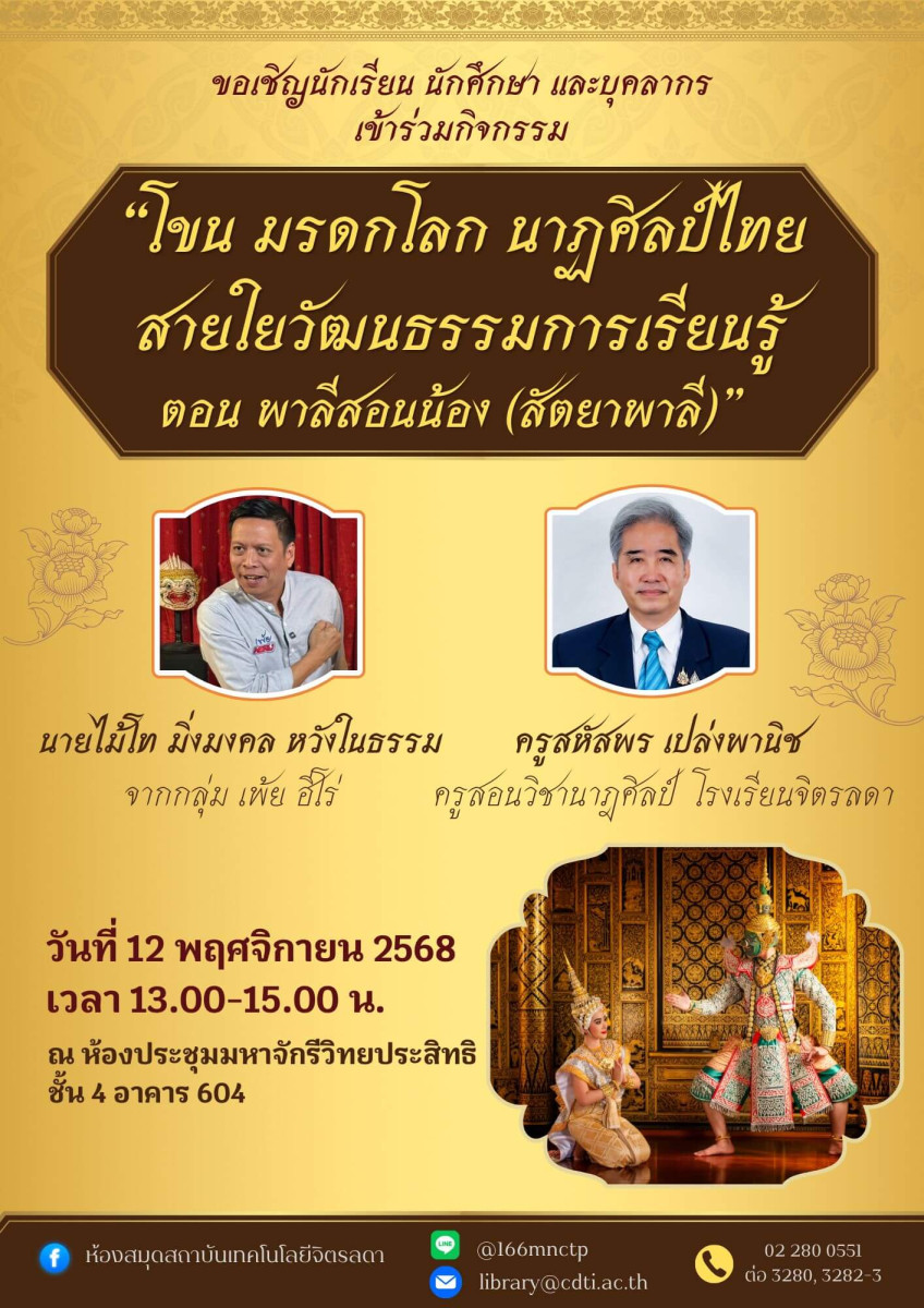 วันที่ 12 พฤศจิกายน 2568 จัดโครงการ โขน มรดกโลก นาฏศิลป์ไทย สายใยวัฒนธรรมการเรียนรู้ หัวข้อ “พาลีสอนน้อง (สัตยาพาลี)” งานวิทยทรัพยากร เห็นความสำคัญของโขนซึ่งเป็นนาฏศิลป์ชั้นสูงของไทยที่มีรากเหง้ามาจากวรรณคดีเรื่องรามเกียรติ์ ถ่ายทอดผ่านการแสดงที่ผสมผสานศิลปะหลายแขนง ไม่ว่าจะเป็นการร่ายรำ ดนตรีไทย การแต่งกายอันวิจิตรและการเล่าเรื่องด้วยท่าทางอันทรงพลัง โขนถือเป็นมรดกทางวัฒนธรรมที่สะท้อนถึงภูมิปัญญา ความประณีตและเอกลักษณ์ของชาติไทย ในอดีต โขนเป็นการแสดงที่สงวนไว้เฉพาะในราชสำนักและงานพิธีสำคัญ วัตถุประสงค์ เพื่อเป็นการส่งเสริมความรู้ ความเข้าใจเกี่ยวกับโขนและอนุรักษ์ศิลปวัฒนธรรมไทย ซึ่งเป็นมรดกทางวัฒนธรรมที่ทรงคุณค่าและควรแก่การสืบสานให้คงอยู่สืบไป เพื่อให้เกิดการเรียนรู้และตระหนักถึงความสำคัญของศิลปะการแสดงโขนในบริบทวัฒนธรรมไทย ปลูกฝังจิตสำนึกและความภาคภูมิใจในศิลปวัฒนธรรมไทยผ่านการเรียนรู้เชิงสร้างสรรค์ และสร้างพื้นที่แห่งการแลกเปลี่ยนเรียนรู้ระหว่างผู้เชี่ยวชาญด้านโขนกับนักเรียน นักศึกษา คณาจารย์ และบุคลากรของสถาบันเทคโนโลยีจิตรลดา